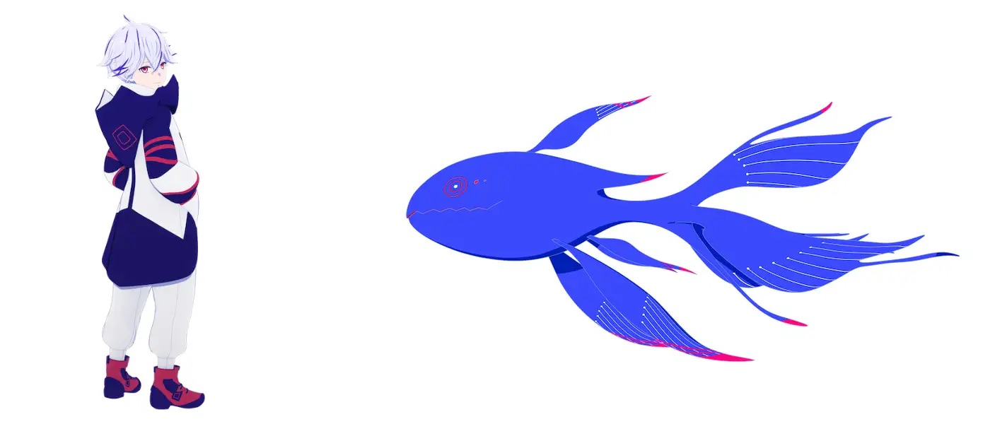 人間形態時は背の低い少年の姿をしているが、正体は巨大な青い魚の怪物。