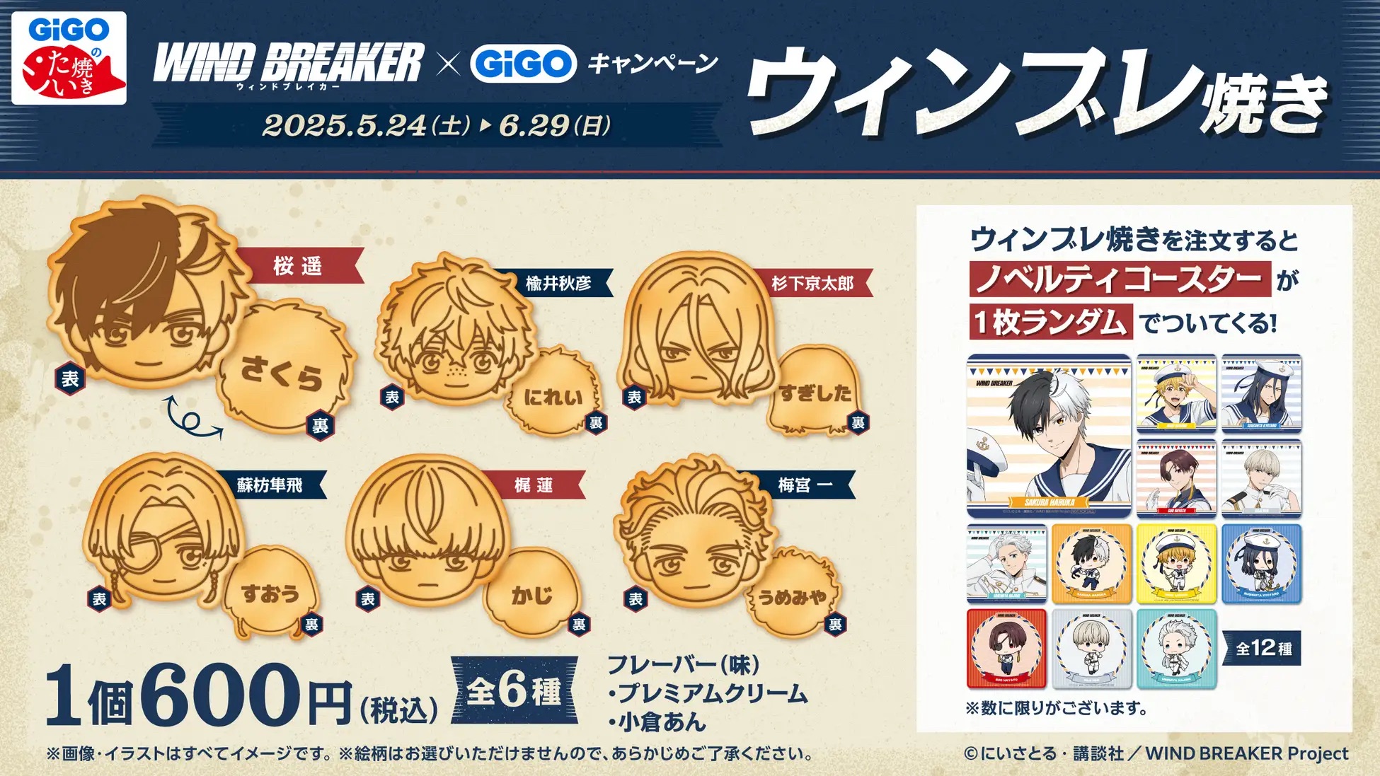 GiGOのたい焼きにて、描き下ろしキャラクター6名をモチーフにしたコラボたい焼き「ウィンブレ焼き」を販売。「ウィンブレ焼き」ご購入1点につき、オリジナルコースター(全12種)をランダムで1枚進呈。